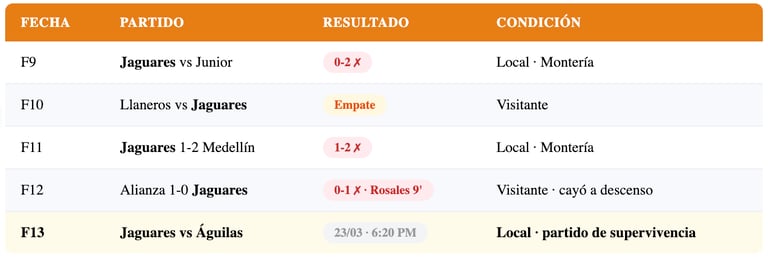 Los resultados recientes de Jaguares evidencian la irregularidad que los tiene en el fondo de la tabla. En la Fecha 11 cayeron 1-2 ante Medellín en el Jaraguay — Medellín marcó temprano y los cordobeses no pudieron remontar. En la Fecha 9 perdieron 0-2 ante Junior en casa, con un equipo barranquillero que fue superior de principio a fin.