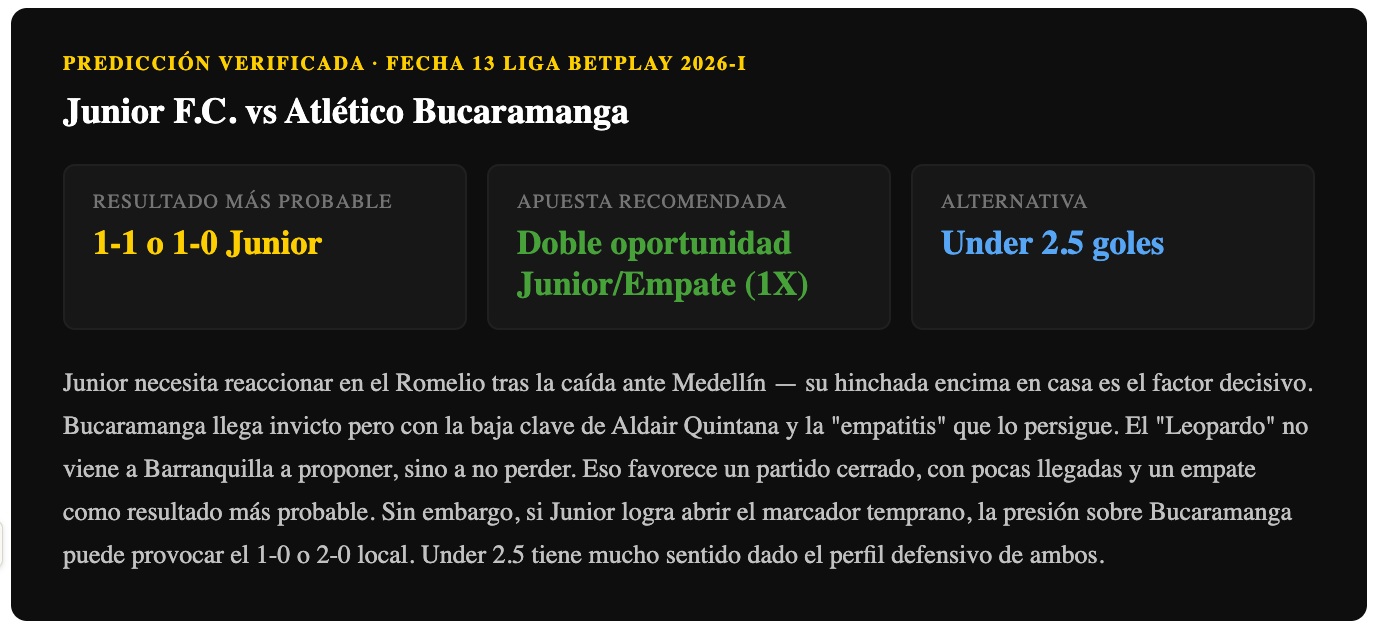 Con las dos historias recientes — la presión local de Junior tras la caída en Medellín y la solidez estructural del invicto de Bucaramanga — esperamos un partido disputado y parejo. La localía del Romelio con la hinchada encima después de la derrota ante el DIM puede marcar la diferencia. Sin embargo, Bucaramanga no pierde desde noviembre de 2025 y su organización defensiva es lo más sólido del torneo.