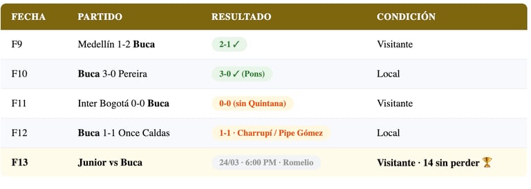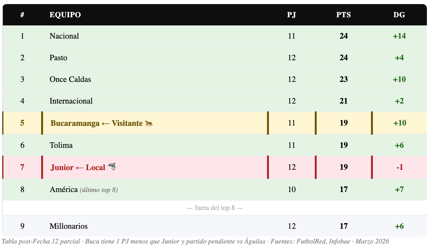 ⚡ FACTOR CLAVE: Bucaramanga tiene 11 partidos jugados — uno menos que Junior (12 PJ). Además, tiene un partido pendiente ante Águilas Doradas. Si el "Leopardo" gana hoy y luego vence a Águilas, saltará al top 3 o 4 de la tabla con 25 puntos.