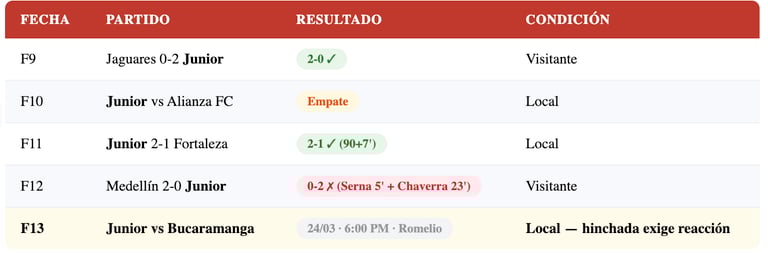 La realidad del vigente campeón no es la que sus hinchas esperaban. Junior lleva 12 partidos y suma 19 puntos, pero su rendimiento reciente genera preocupación. En la Fecha 12, cayó 0-2 ante Independiente Medellín en el Atanasio Girardot, con goles de Alexis Serna (5') y Francisco Chaverra (23') — los dos primeros en el arranque del partido. El técnico uruguayo Alfredo Arias reconoció en rueda de prensa que "el plan a los 5 minutos ya no estaba", lo que resume la fragilidad táctica del equipo. El partido además estuvo marcado por disturbios en las tribunas, cuando hinchas del Junior ingresaron al estadio y provocaron incidentes que detuvieron el juego 10 minutos.