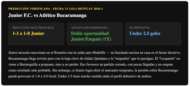 Pronóstico Junior vs Atlético Bucaramanga — Fecha 13 Liga BetPlay 2026