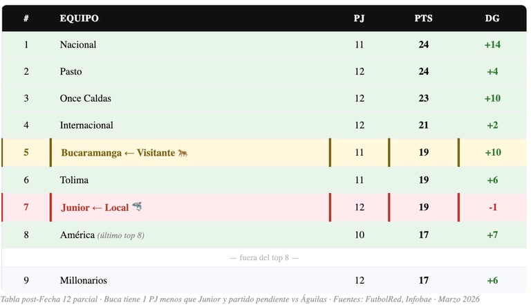 📊 Junior F.C. — Liga BetPlay 2026-I (12 PJ): 19 puntos · 7° lugar · DG -1