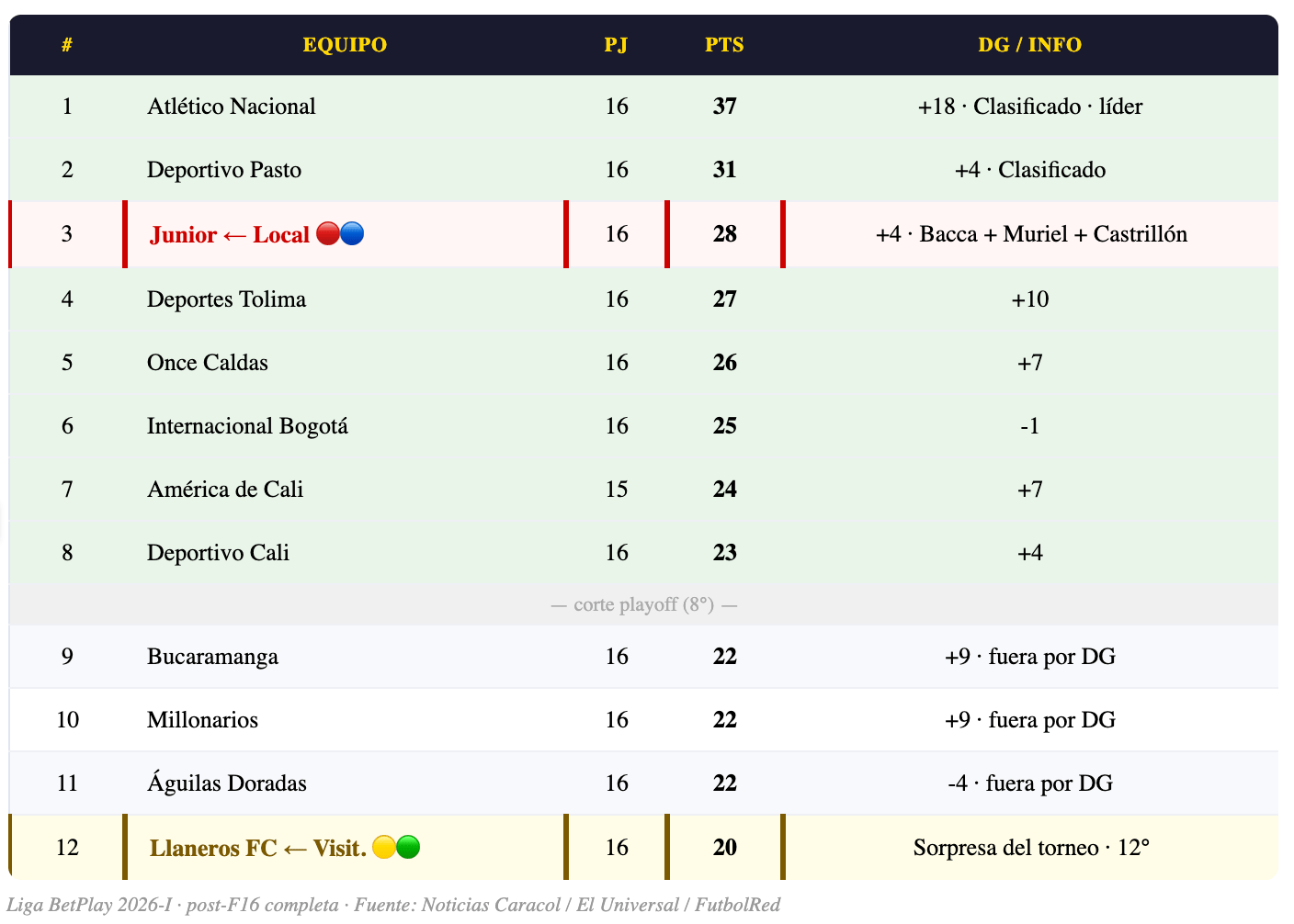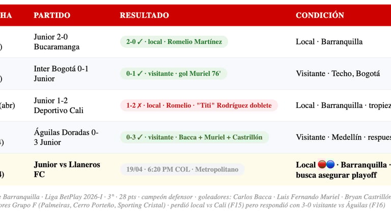🦈 3° CON 28 PUNTOS: Junior viene de recuperarse con la goleada 3-0 a Águilas Doradas — goles de Bryan Castrillón, Carlos Bacca y Luis Fernando Muriel. Con 28 puntos en la 3ª posición, el Tiburón está muy cerca de asegurar matemáticamente su clasificación al playoff. Una victoria ante Llaneros en el Metropolitano lo consolidaría aún más.