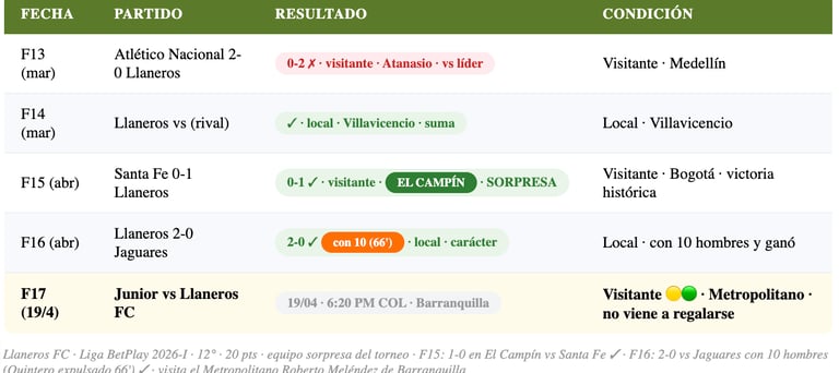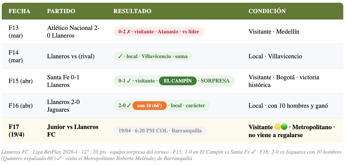 Llaneros FC — el equipo de Villavicencio — ha sido una de las sorpresas positivas de la Liga BetPlay 2026-I. Con 20 puntos en la 12ª posición, los llaneros han dado varios golpes inesperados: ganaron 1-0 en El Campín ante Santa Fe en F15, y en F16 vencieron 2-0 a Jaguares en casa. El detalle que habla de su carácter: en F16 Dennys Quintero fue expulsado al 66' y Llaneros aguantó el 2-0 con 10 hombres. Visitar el Metropolitano siempre es difícil, pero este equipo demuestra que no viene a regalarse.