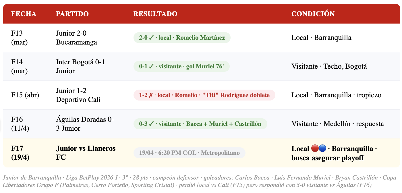 El Tiburón recibe a la sorpresa del torneo en el Metropolitano. Junior (3°, 28 pts, goleó 3-0 a Águilas con Bacca+Muriel+Castrillón) vs Llaneros FC (12°, 20 pts, ganó en El Campín vs Santa Fe, aguantó con 10 hombres). Domingo 19/4, 6:20 PM Colombia. Win Sports.
