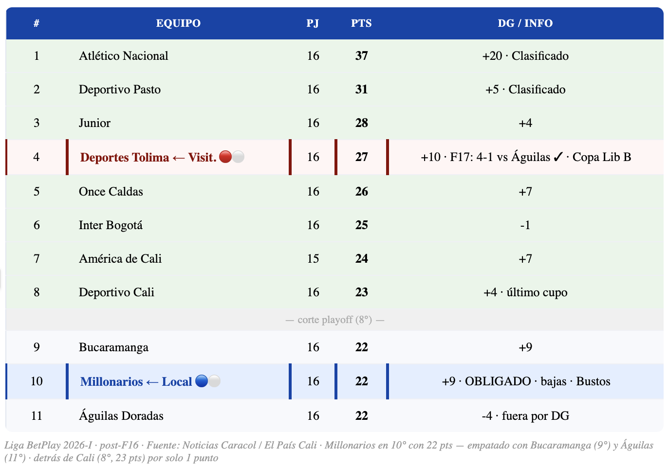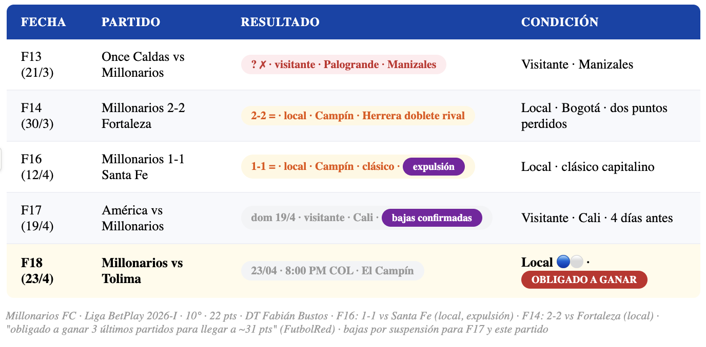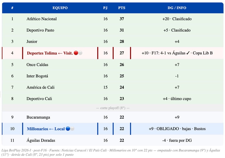 🔵⚪ MILLONARIOS CON LA SOGA AL CUELLO: FutbolRed confirma — con 22 puntos en la F16, el Embajador quedó "obligado a ganar sus últimos tres partidos para tratar de llegar a las 31 unidades y esperar resultados". Este partido vs Tolima es el segundo de esa secuencia vital. Una derrota lo dejaría prácticamente eliminado.