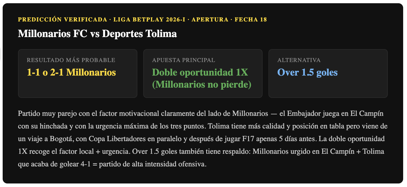 Pronóstico Millonarios vs Deportes Tolima — Liga BetPlay 2026