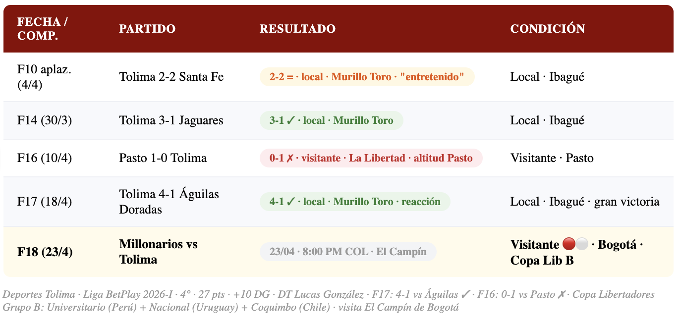 Deportes Tolima — el Vinotinto y Oro de Ibagué — llega al partido desde el 4° lugar con 27 puntos. El DT Lucas González tiene a los Pijaos bien posicionados, con Copa Libertadores en el Grupo B (Universitario, Nacional URU y Coquimbo Unido). Sin embargo, la derrota 0-1 en Pasto en F16 y el empate 2-2 ante Santa Fe en el partido aplazado de F10 muestran que Tolima no es invulnerable. Visitar El Campín de Bogotá siempre es un reto, pero Tolima tiene la calidad para someter a un Millonarios con bajas y bajo presión.