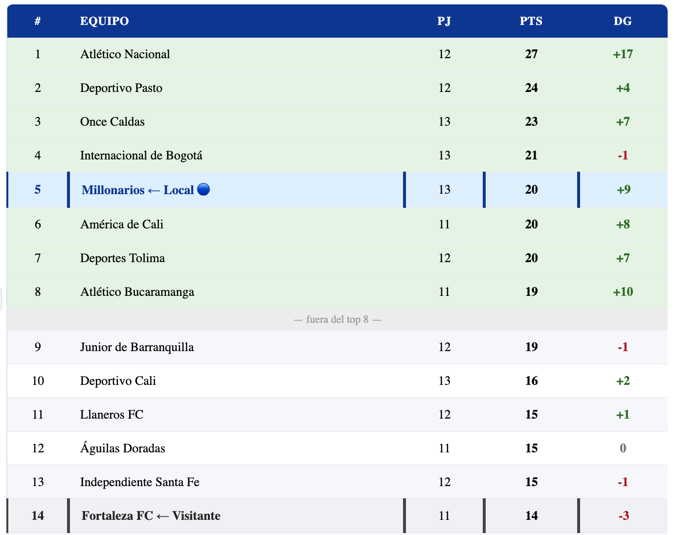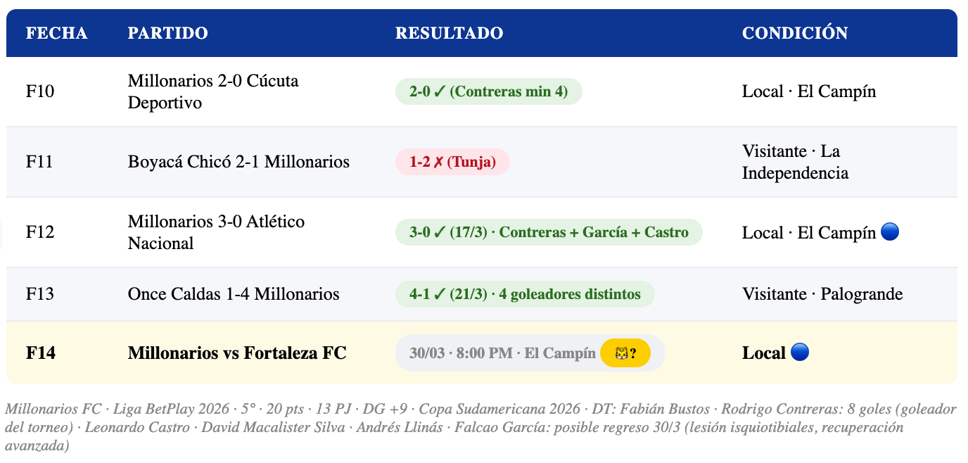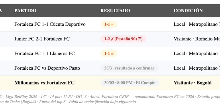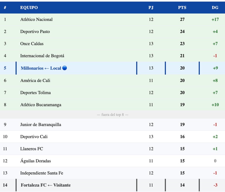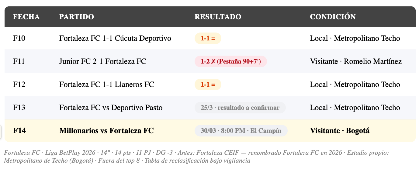 En el torneo, Fortaleza está en la posición 14 con 14 puntos en 11 partidos — fuera del top 8 pero a una distancia razonable del puesto 8 (19 pts de Bucaramanga). Sin embargo, la preocupación real no es solo el top 8 — en la tabla de reclasificación acumulada, Fortaleza necesita sumar para alejarse de la zona comprometida. El partido contra Millonarios en el Campín, contra un rival en racha brutal, es uno de los retos más difíciles de su calendario.