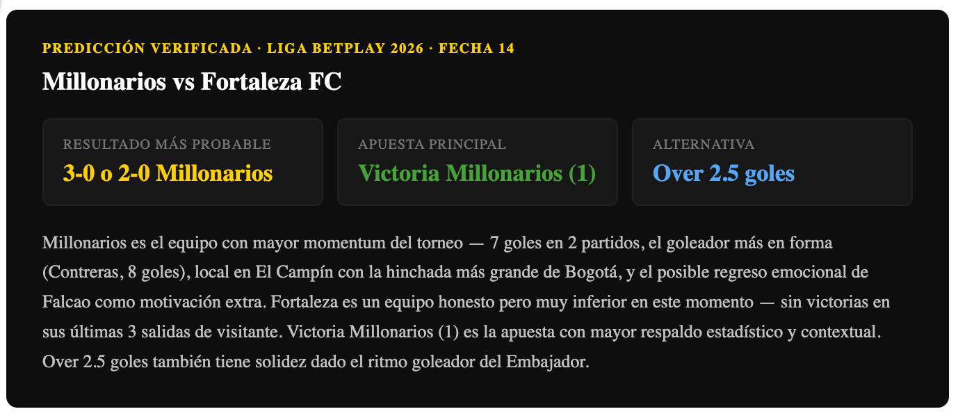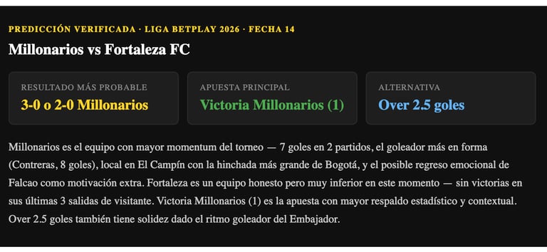 Pronóstico Millonarios vs Fortaleza FC — Fecha 14 Liga BetPlay 2026