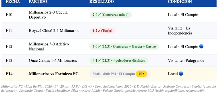 El arranque de temporada de Millonarios fue complicado — el equipo tardó en encontrar su mejor versión bajo la dirección del DT argentino Fabián Bustos. Pero las últimas dos fechas cambiaron todo el panorama. Primero el 3-0 a Atlético Nacional en El Campín (F12) — con goles de Rodrigo Contreras, Mateo García y Leonardo Castro — que sacudió la parte alta de la tabla. Luego el 4-1 a Once Caldas en el Palogrande (F13) — con goles de Beckham Castro, David Macalister Silva, Rodrigo Contreras y Andrés Llinás. Dos victorias que consolidaron a Millonarios como uno de los equipos más en forma del torneo.