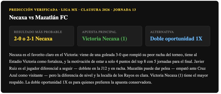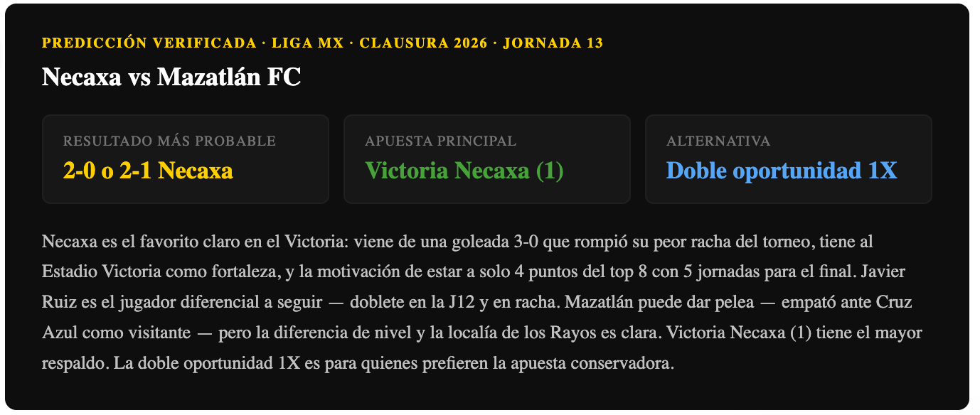 Pronóstico Necaxa vs Mazatlán FC — Jornada 13 Clausura 2026 Liga MX