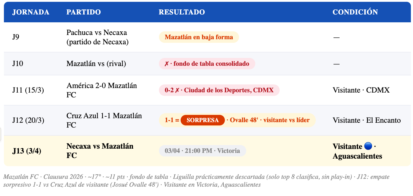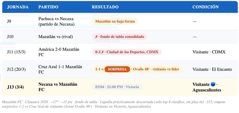 📊 Mazatlán FC — J13: ~17° · ~11 pts · fondo de la tabla · eliminación de Liguilla muy probable