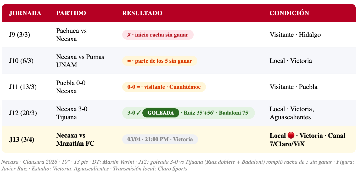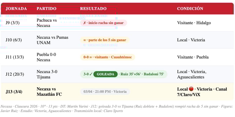 ⚡ GOLEADA QUE CAMBIÓ TODO: En la J12 (20 de marzo), Necaxa venció 3-0 a Tijuana en el Estadio Victoria tras llegar al partido con 5 partidos consecutivos sin ganar. Los goles fueron de Javier Ruiz (doblete: 35' y 56') y Tomás Badaloni (75'). El Financiero lo calificó como "una de sus actuaciones más completas del torneo." Con ese resultado, los Rayos llegaron a 13 puntos y subieron al 10° puesto.
