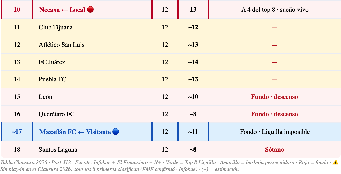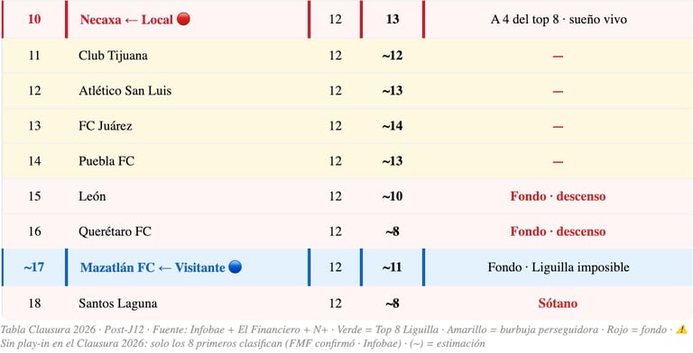 Un dato clave para entender la urgencia de ambos equipos: el presidente de la FMF, Mikel Arriola, confirmó que el Clausura 2026 no tendrá ronda de play-in. Solo los 8 primeros equipos de la tabla clasifican directamente a los cuartos de final de la Liguilla. Eso significa que Necaxa (10°) necesita ganar y que equipos por encima pierdan puntos para escalar. Para Mazatlán (fondo), la Liguilla ya es prácticamente un sueño inalcanzable — pero los puntos siguen importando para el orgullo y para la tabla de cocientes del descenso.