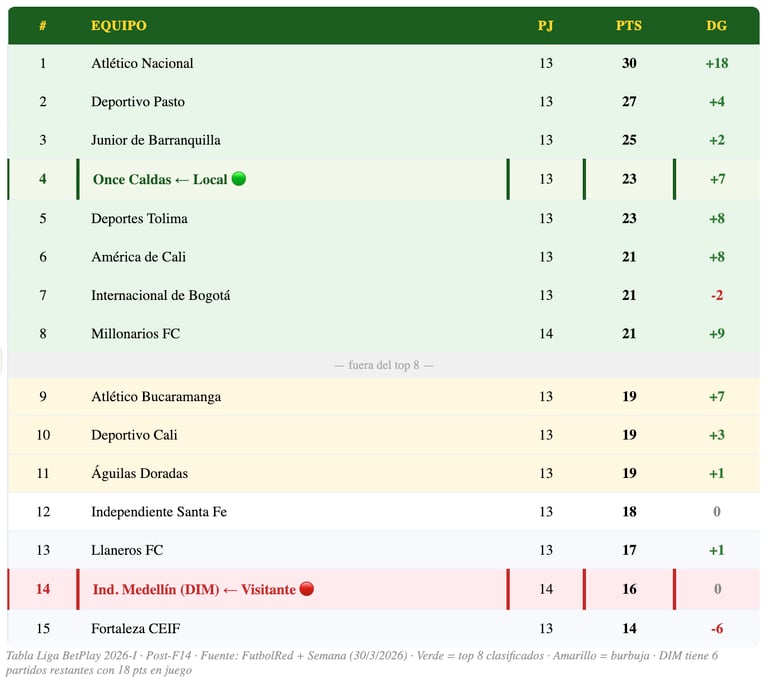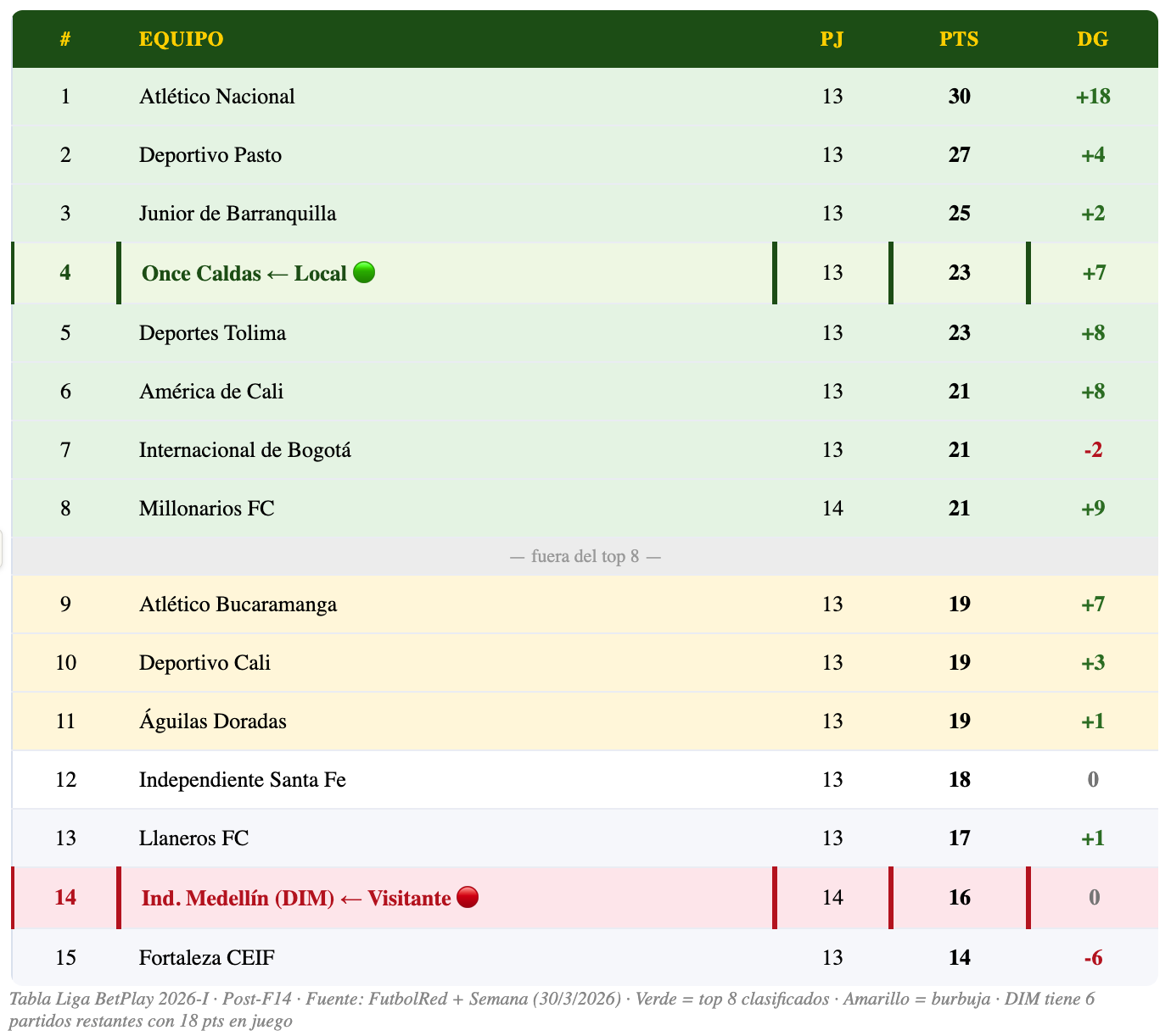 Cierre del jueves en el Palogrande. Once Caldas (4°, 23 pts, ex líder) recibe al DIM (14°, 16 pts) que viene de una remontada histórica ante América y debuta en Copa Libertadores en 6 días. 8:30 PM. Win+. Predicción verificada.