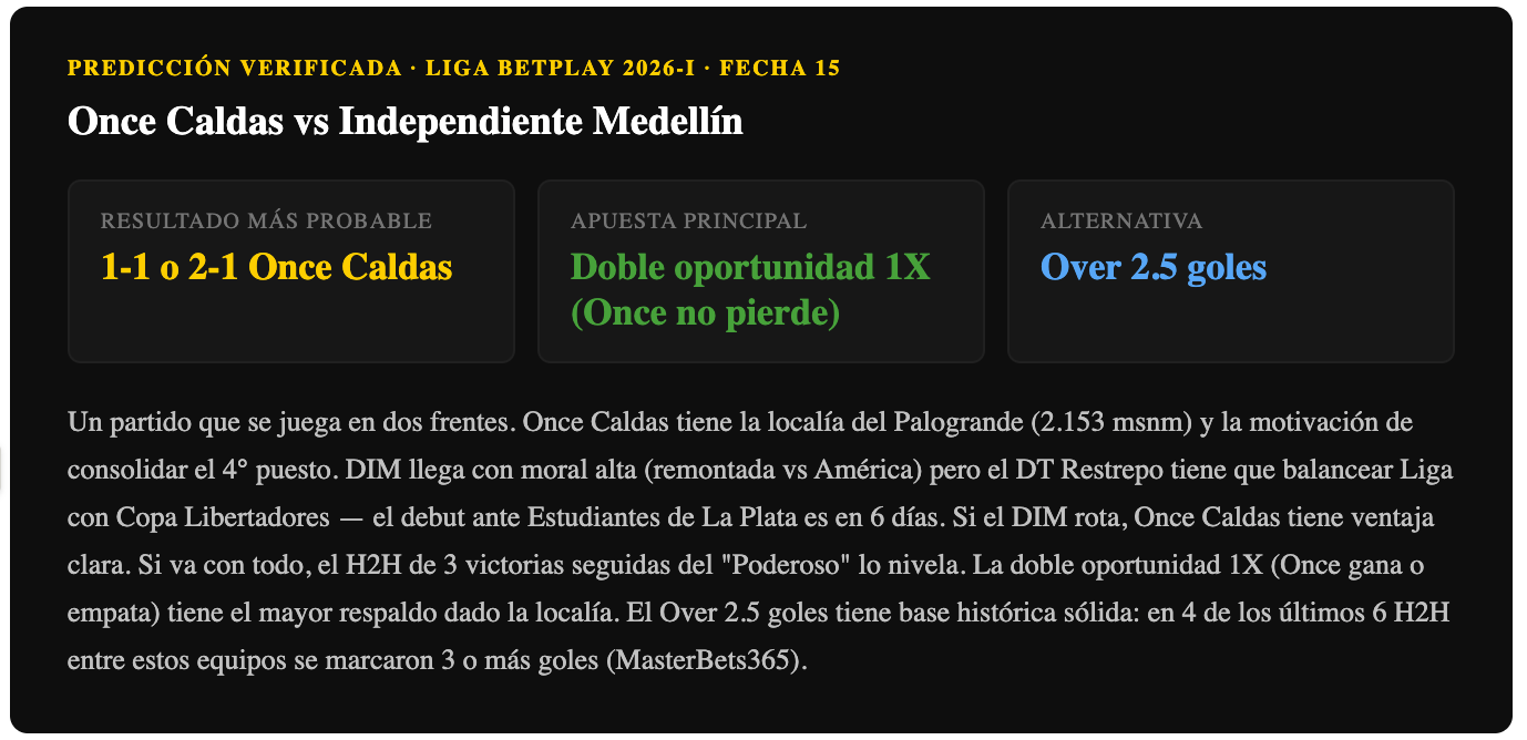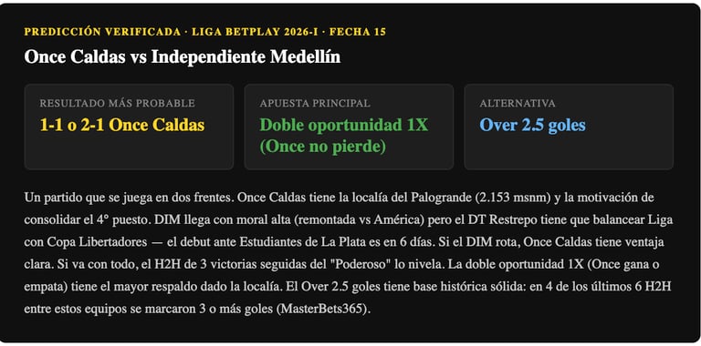 Once Caldas tiene la localía del Palogrande, la altitud a su favor y la necesidad de sumar para consolidar el 4° puesto. Pero DIM llega en racha anímica alta (remontada ante América) y con el H2H de los últimos 3 duelos a su favor. La variable Copa Libertadores es decisiva — si Restrepo rota, Once Caldas tiene ventaja clara. Si el DIM va con todo, el partido se nivela. MasterBets365 señala que "en 4 de los últimos 6 H2H se marcaron al menos 3 goles" — el Over 2.5 tiene base histórica sólida.