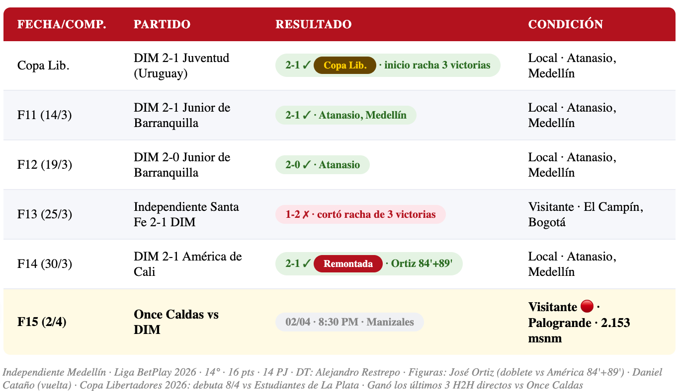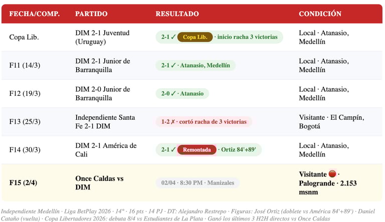 ⚡ LA REMONTADA AGÓNICA: DIM llega al Palogrande con la moral muy alta tras la remontada del 30 de marzo ante América. Iba perdiendo 0-1 con gol de Yeison Guzmán (25'), pero José Ortiz marcó dos cabezazos en los minutos 84 y 89 para el 2-1 final. El Colombiano lo describe como "una remontada que emuló las conseguidas en el segundo semestre de 2025." Ese momento encendió al "Poderoso".