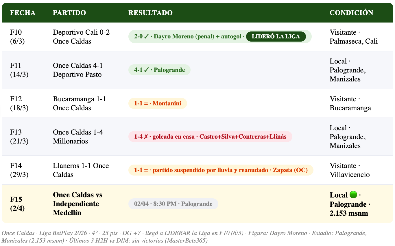 Once Caldas tuvo un momento estelar en este torneo: el 6 de marzo venció 2-0 al Deportivo Cali en Palmaseca (con penal de Dayro Moreno y autogol de Andrés Felipe Correa) y se instaló como líder de la Liga BetPlay con 19 puntos (Infobae). Desde entonces, la regularidad bajó. La goleada 1-4 sufrida ante Millonarios en el Palogrande (F13, 21 de marzo) fue el peor resultado del torneo para el "Blanco Blanco" — Beckham Castro, Macalister Silva, Rodrigo Contreras y Andrés Llinás golearon en casa. El empate 1-1 ante Llaneros en Villavicencio (F14, partido suspendido por lluvia y reanudado) no mejoró el panorama.