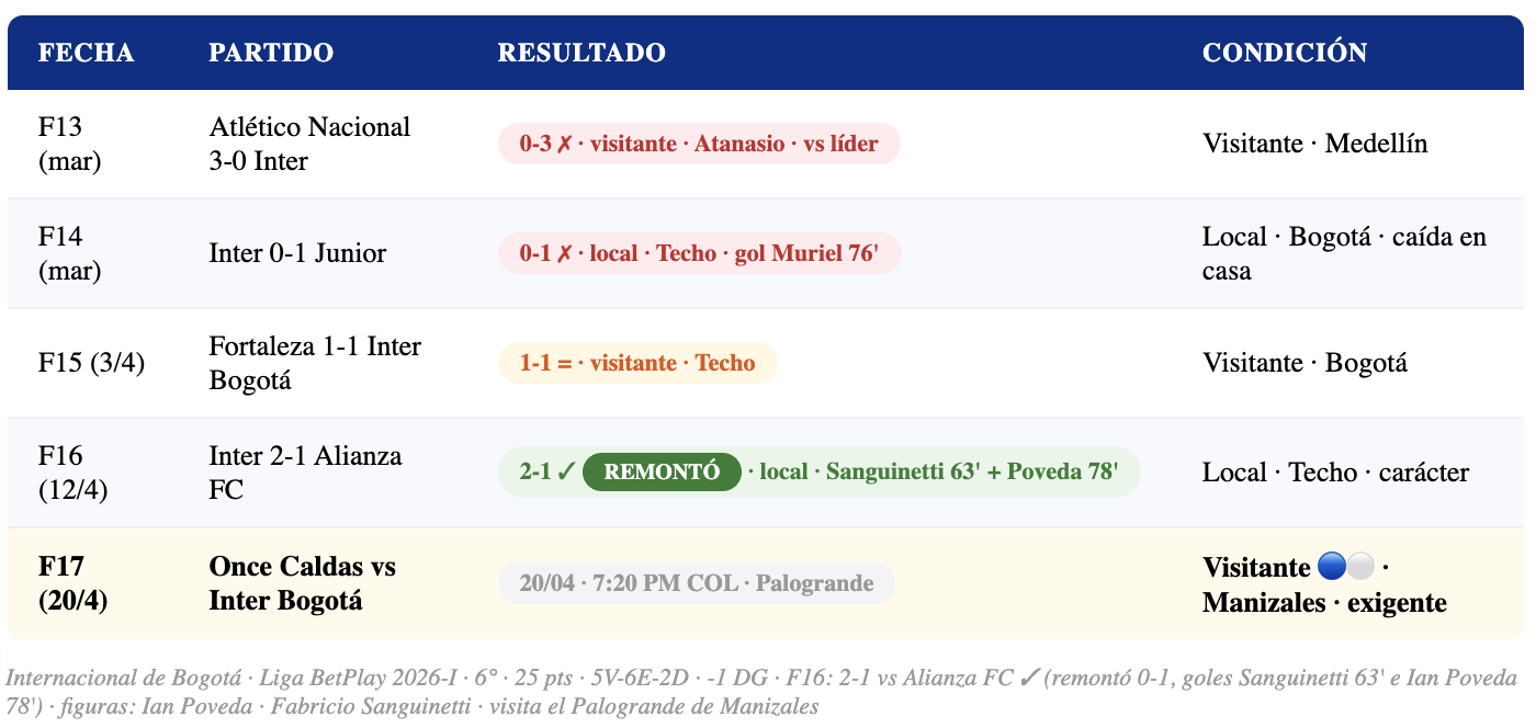Internacional de Bogotá — el equipo capitalino que sorprendió a propios y extraños liderando la tabla en las primeras fechas — llega al partido en buen estado. La victoria 2-1 sobre Alianza FC en F16, remontando un marcador adverso con goles de Fabricio Sanguinetti (63') e Ian Poveda (78'), es una muestra del carácter del equipo. Con 25 puntos en la 6ª posición y una diferencia de gol de -1, Inter Bogotá necesita sumar en Manizales para no perder terreno. Visitar el Palogrande es uno de los desplazamientos más exigentes del fútbol colombiano.
