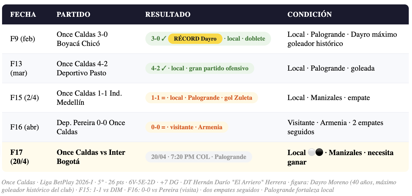 Once Caldas llega al partido con dos empates seguidos que no le hacen daño mayor a su posición pero que generan cierta inquietud. El DT Hernán Darío "El Arriero" Herrera tiene en Dayro Moreno — 40 años — al máximo goleador histórico del club y a la figura que puede desequilibrar. El Estadio Palogrande de Manizales es una fortaleza en el FPC — el calor y la altura de la capital caldense hacen sufrir a los visitantes. Once Caldas no puede perder puntos en casa si quiere seguir en la parte alta.