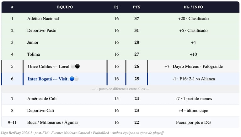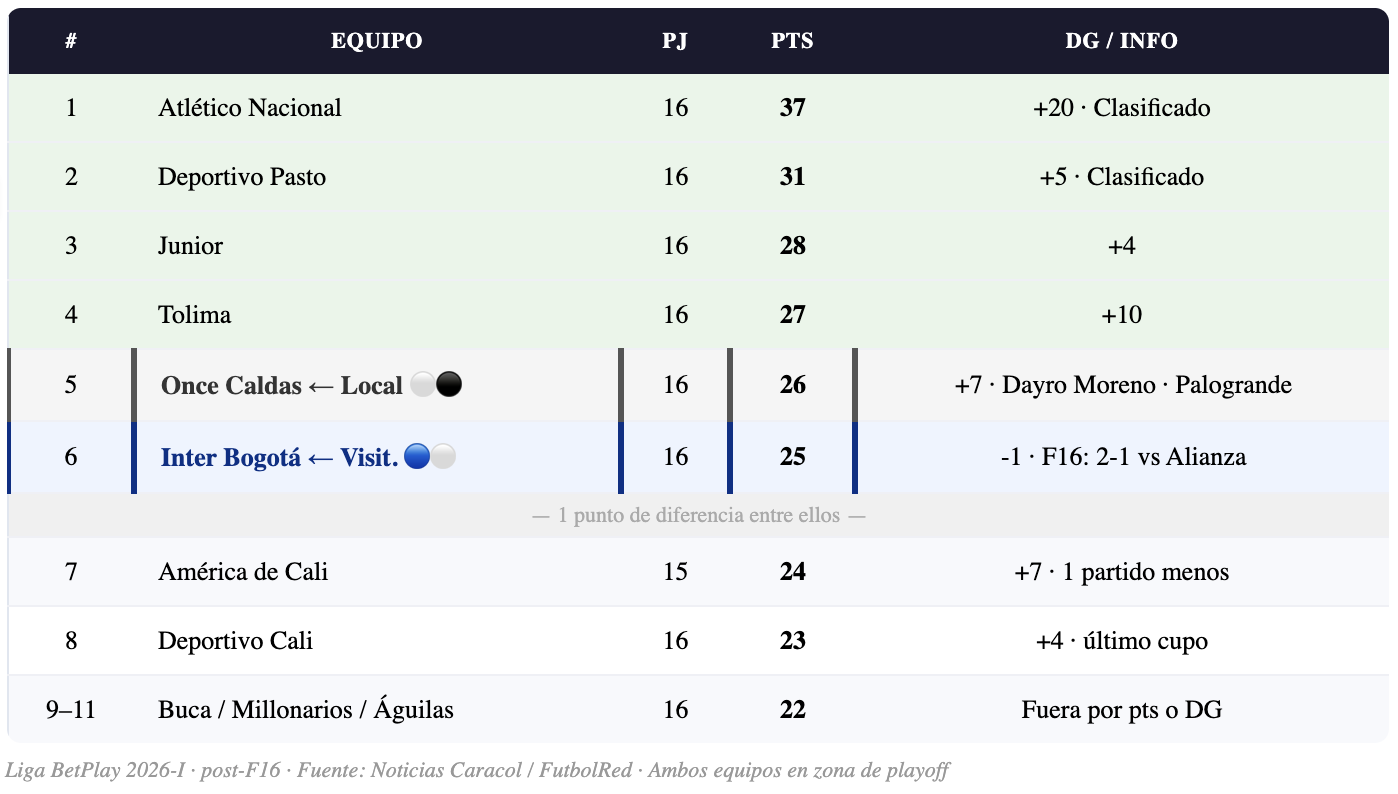 📊 TABLA POST-F16: Once Caldas 5° · 26 pts · +7 DG. Inter Bogotá 6° · 25 pts · -1 DG. Solo 1 punto de diferencia. Ambos clasificados al playoff en este momento — pero la tabla sigue apretada con Bucaramanga, Millonarios y Águilas a 22 pts cada uno.