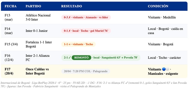 🔵⚪ INTER BOGOTÁ: Llega en buen momento tras la victoria 2-1 sobre Alianza FC en F16 — remontó un 0-1 con goles de Sanguinetti (63') e Ian Poveda (78'). El equipo de la capital suma 25 pts y quiere trepar.