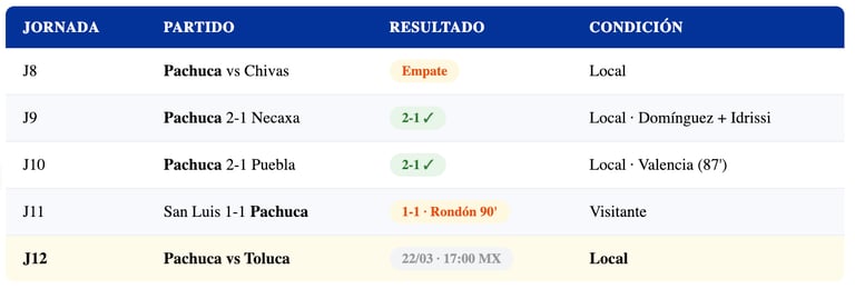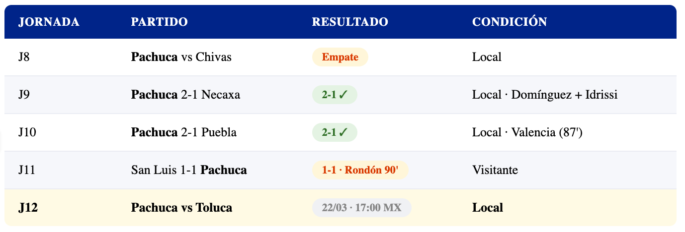 Los Tuzos llegan a esta Jornada 12 en un momento irregular pero sólido como locales. En casa, Pachuca no ha perdido en todo el Clausura — 5 victorias y 1 empate en el Estadio Hidalgo — lo que los convierte en uno de los equipos más fuertes en su cancha del torneo.