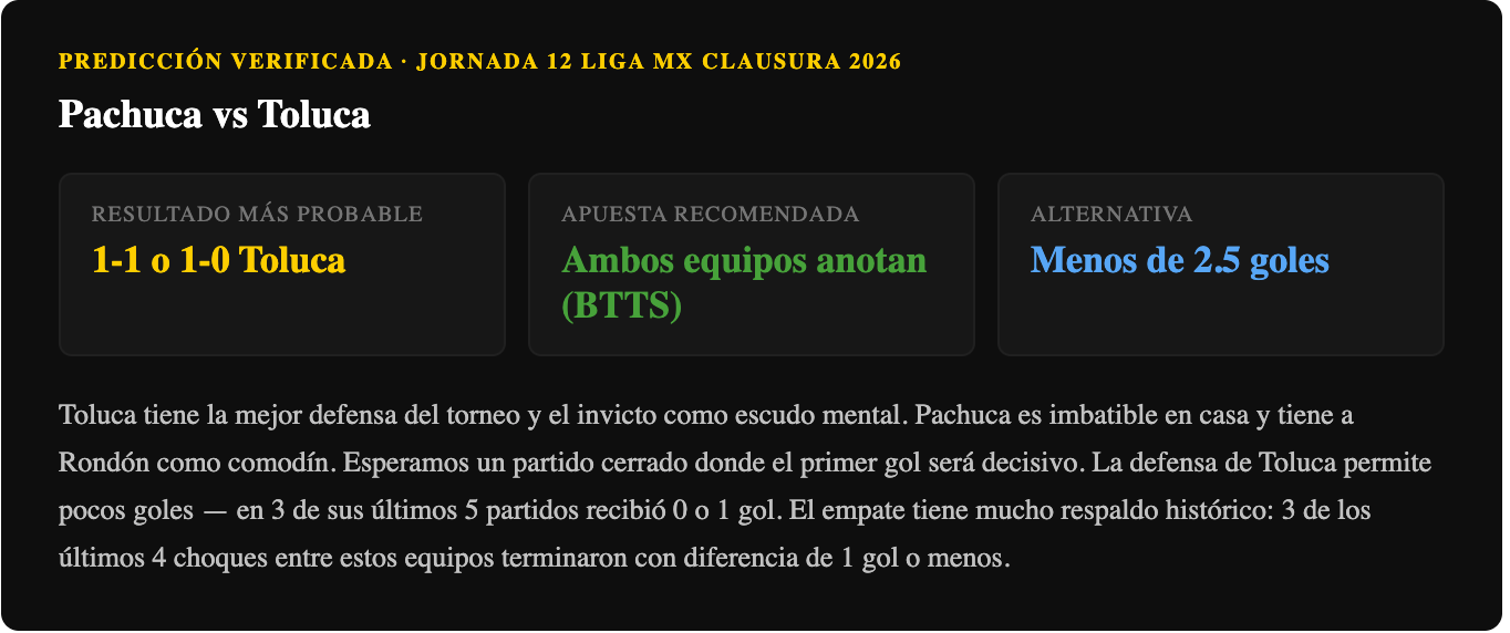 Pronóstico Pachuca vs Toluca — Jornada 12 Liga MX Clausura 2026