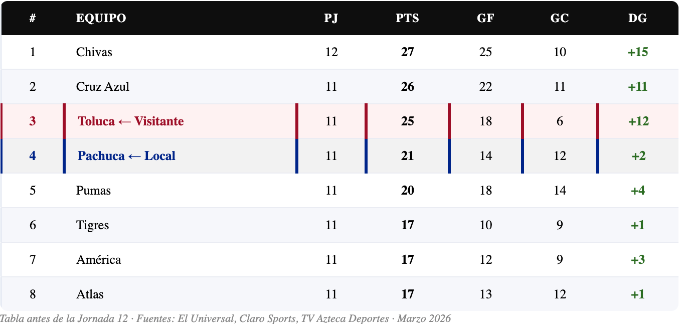 A falta de seis jornadas para cerrar la fase regular, la pelea por los primeros puestos de la tabla está que arde. Chivas lidera con 27 puntos (ya jugó su partido pendiente), seguido de Cruz Azul con 26 y Toluca con 25. Pachuca está cuarto con 21 unidades, y sabe que una derrota hoy puede hacer caer varios puestos.