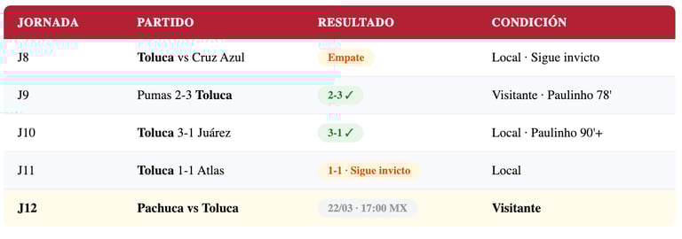 En la J11, Toluca empató 1-1 con Atlas en casa, lo que frenó su camino hacia el liderato. Antes, había vencido 3-1 al Juárez (J10), 3-2 a Pumas de visitante (J9) y 3-0 al Necaxa (J7). El empate ante Atlas fue el primero negativo en varias jornadas para un equipo que mantiene la regularidad como su mayor virtud.