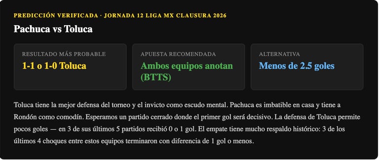 Este es uno de los partidos más difíciles de predecir del fin de semana. Toluca tiene la mejor defensa del torneo y el invicto como escudo mental. Pachuca tiene la localía, la motivación de romper ese escudo y a Rondón como arma letal.