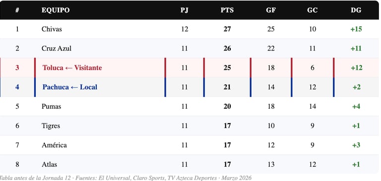 El Estadio Hidalgo se convierte este domingo en el escenario más interesante de la Jornada 12 del Clausura 2026. Pachuca recibe al único equipo invicto de la Liga MX: el Toluca de Antonio "Turco" Mohamed, campeón bicampeón defensor que llega con 11 jornadas sin conocer la derrota y la mejor defensa del torneo. Los Tuzos, cuartos en la tabla con 21 puntos y un local que aún no ha perdido en casa, quieren ser los primeros en romper ese escudo escarlata. Un duelo de líderes, de sistemas, de orgullo. Y con la Liguilla ya dibujándose en el horizonte.