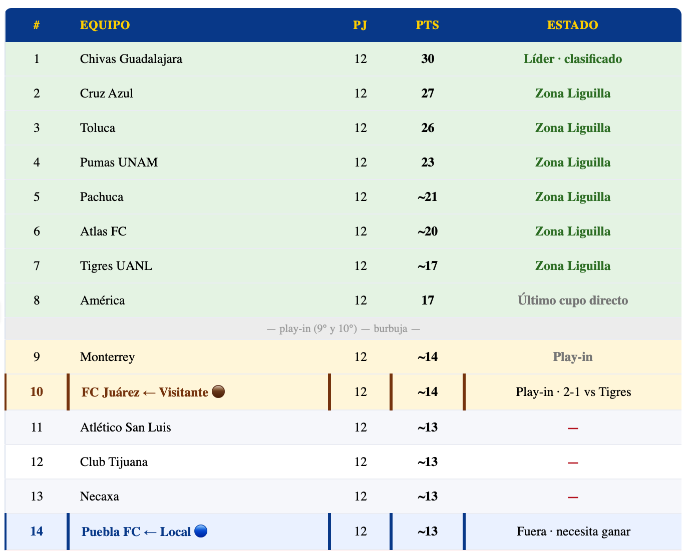 📊 Puebla FC — J13: 14° · ~13 pts · fuera de zona Liguilla y play-in · necesita ganar
