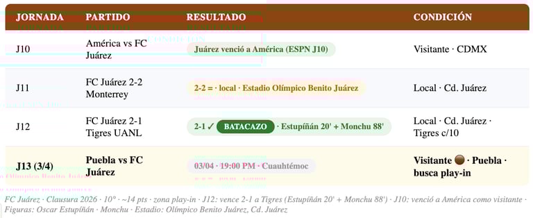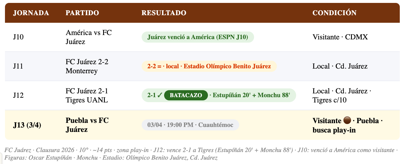📊 FC Juárez — J13: 10° · ~14 pts · zona play-in · un triunfo los mete al top 8