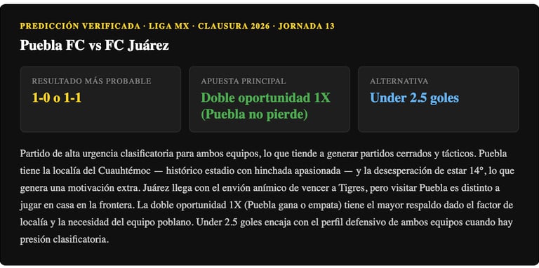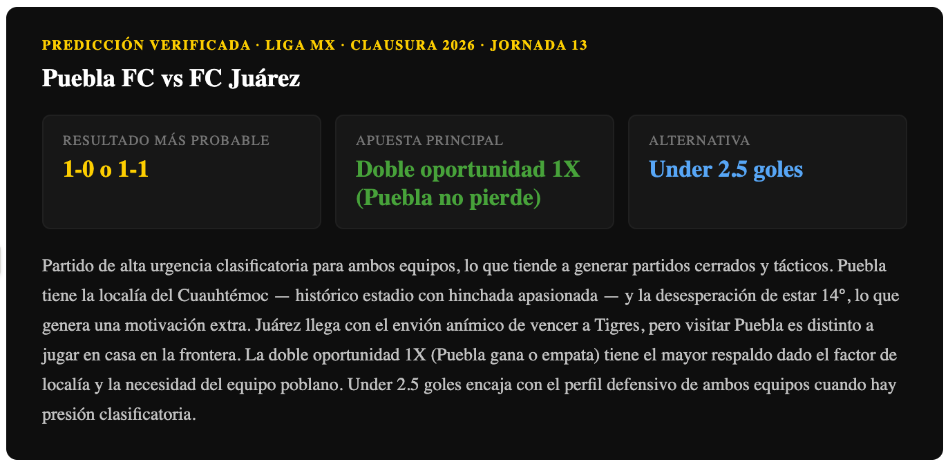 Partido equilibrado entre dos equipos en necesidad. Puebla tiene la localía del Cuauhtémoc y la desesperación de estar 14°. Juárez llega con el envión del triunfo ante Tigres, pero visitar Puebla es un desafío diferente. La doble oportunidad 1X (Puebla no pierde) tiene respaldo dado el factor local. Under 2.5 goles también encaja — ambos equipos tienen dificultades para generar muchos goles y los partidos de necesidad tienden a ser cerrados.