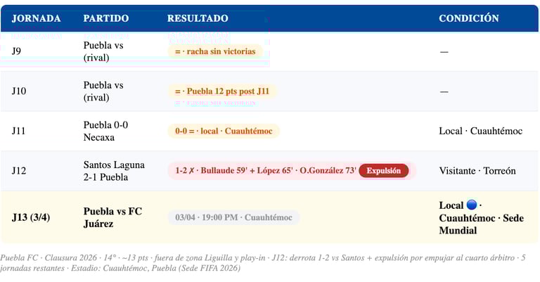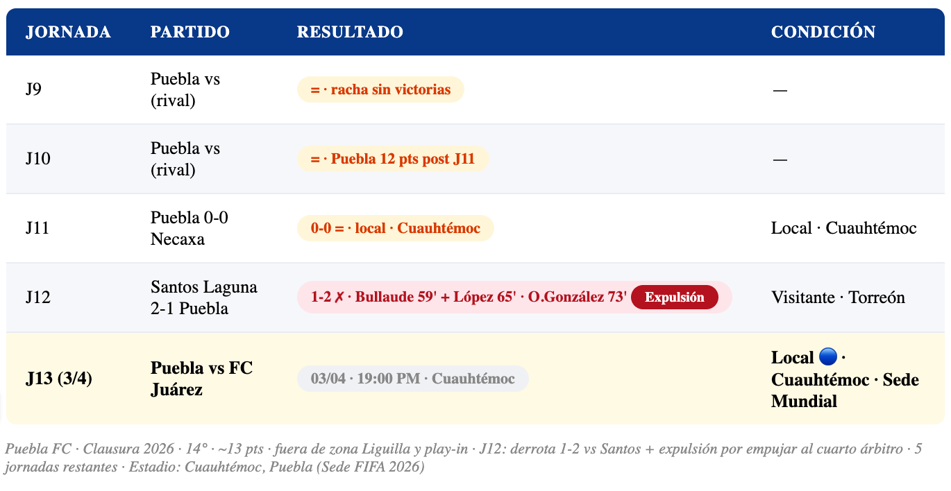 Puebla FC atraviesa su peor momento del Clausura 2026. La derrota 1-2 ante Santos Laguna en la J12 — con goles de Bullaude (59') y López (65') para Santos, y el descuento de Owen González (73') para la Franja — fue el último golpe de una racha sin victorias que los hundió al 14° lugar. Para colmo, un jugador de Puebla fue expulsado durante ese partido por empujar al cuarto árbitro — un episodio que habla del estado anímico del equipo. En el Cuauhtémoc buscarán romper esa racha ante su gente.