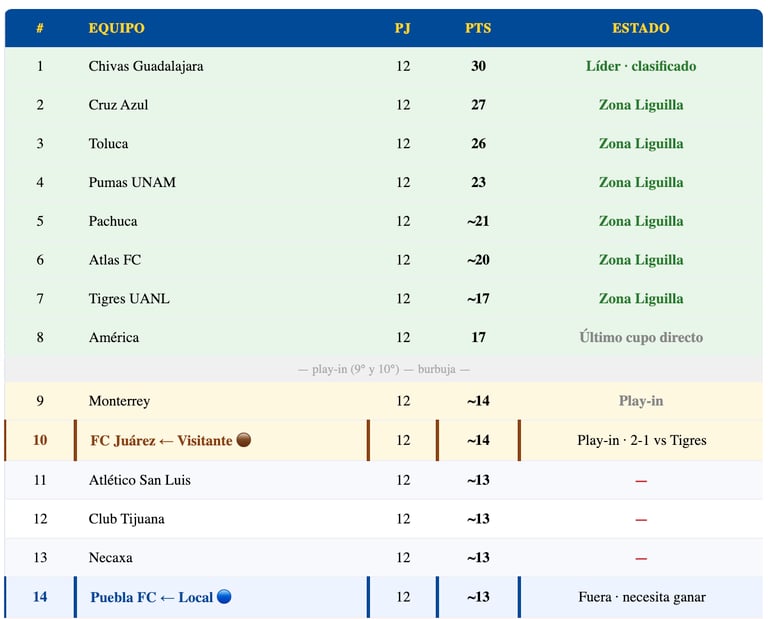 Con 5 jornadas restantes, el Clausura 2026 entra en su recta decisiva. Chivas lidera cómodamente con 30 puntos. Debajo, Cruz Azul (27 pts) y Toluca (26 pts) pelean por el segundo lugar. Los 8 primeros clasifican directamente a cuartos de final; el 9° y 10° van al play-in. Puebla (14°) necesita una racha ganadora urgente. Juárez (10°) está exactamente en el límite del play-in.