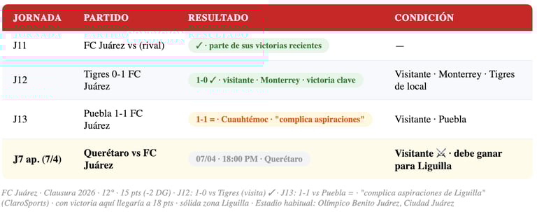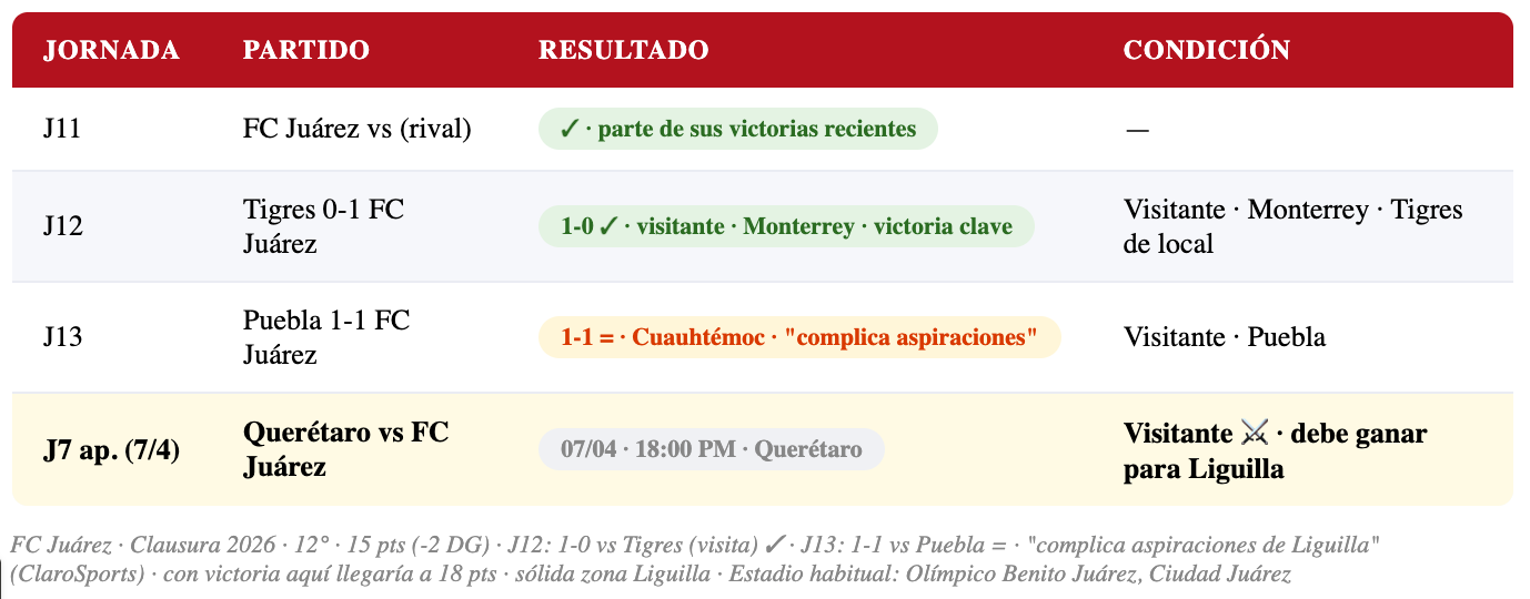 FC Juárez llega al partido con la necesidad de ganar para no perder el tren a la Liguilla. Con 15 puntos en el 12° lugar, los Bravos están dentro de la zona de clasificación de momento — pero con solo 4 jornadas de la fase regular más este partido pendiente, cada punto es vital. El empate 1-1 ante Puebla en J13 frenó el impulso. Sin embargo, la victoria 1-0 ante Tigres como visitante en J12 demostró que el equipo fronterizo tiene capacidad para ganar fuera de casa. Excélsior ubica a Juárez en el 12° con 15 pts antes de este partido pendiente.