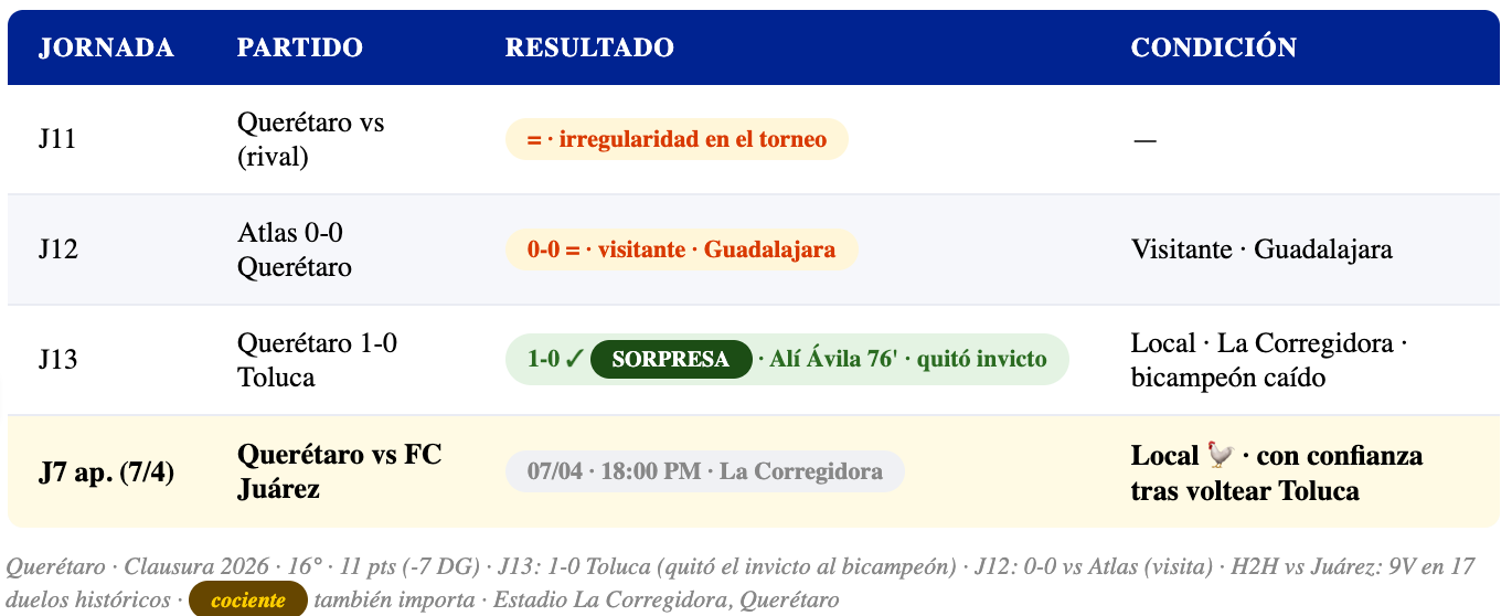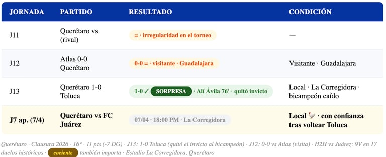 📊 Querétaro — J7 ap.: 16° · 11 pts (-7 DG) · local · La Corregidora