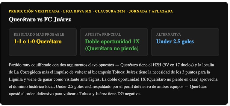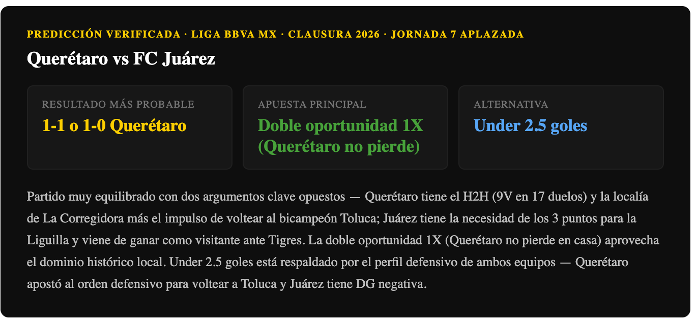 Juárez necesita los 3 puntos más que Querétaro y eso puede pesar. Pero la localía de La Corregidora y el H2H (Querétaro 9V en 17) equilibran las fuerzas. Querétaro viene de voltear al bicampeón Toluca — con confianza alta. Partido muy parejo — empate o victoria local son los resultados más respaldados por estadísticas.
