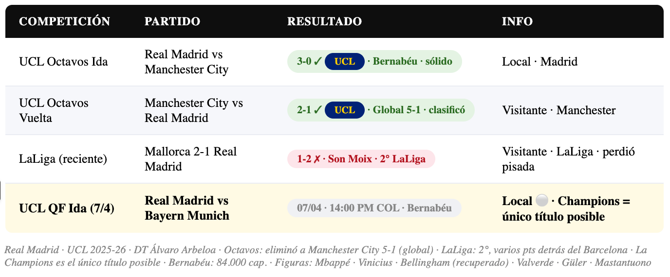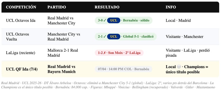 ⚪ Real Madrid — Champions QF ida: 2° LaLiga · Champions: eliminó a Manchester City (global 5-1)