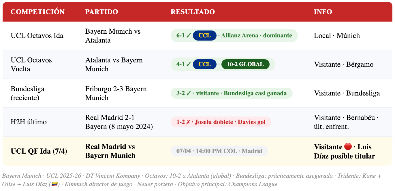 🔴 BAYERN MUNICH: Los bávaros llegaron al Bernabéu en modo demolición. La Atalanta fue arrasada con un global de 10-2 (6-1 y 4-1). En la Bundesliga, derrotaron 3-2 al Friburgo como visitante el fin de semana — con la liga doméstica casi asegurada, la Champions es el gran objetivo de Kompany. Tridente ofensivo peligroso: Harry Kane + Michael Olise + Luis Díaz.