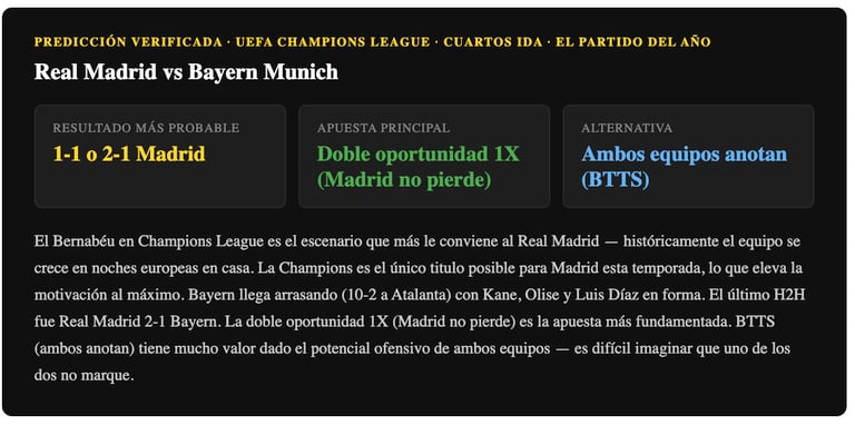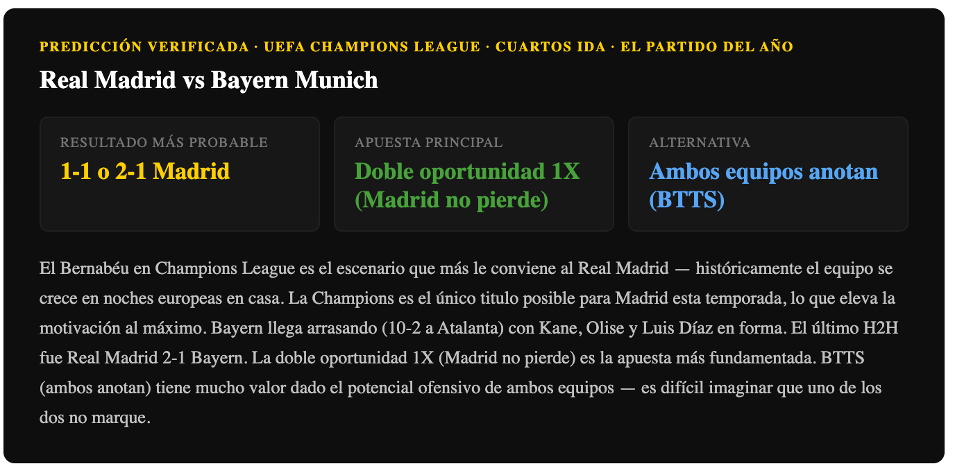 El partido más equilibrado de los cuartos de final. El Bernabéu con 84.000 espectadores es el mayor argumento del Madrid — históricamente es donde los merengues se crecen en Champions. Bayern tiene el momentum ofensivo brutal (10-2 a Atalanta). La última vez que se enfrentaron, Madrid ganó 2-1. Predecir este partido es casi imposible — empate o victoria mínima del local son los resultados más probables. La doble oportunidad 1X (Madrid no pierde en casa) y under 3.5 goles (considerando que puede ser un duelo cerrado) tienen respaldo estadístico.