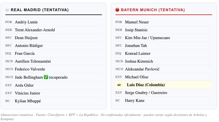 Luis Díaz, el extremo colombiano de Bayern Munich, tiene la posibilidad de actuar este martes en el Santiago Bernabéu — uno de los estadios más icónicos del mundo. La República Perú confirma que "Luis Díaz" figura entre las figuras del plantel de Kompany, y ClaroSports lo incluye en la alineación tentativa. Para la audiencia colombiana, este es el partido que más interés genera de toda la Champions League 2026 — ver a "Lucho" en un estadio de 84.000 personas, en un cuarto de final europeo, contra el Real Madrid, es un espectáculo que ningún colombiano se puede perder.