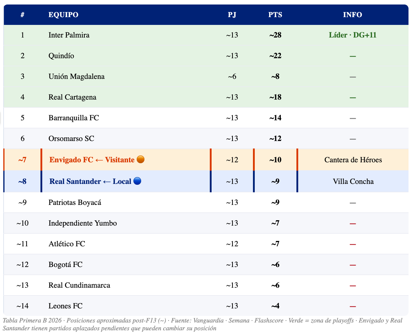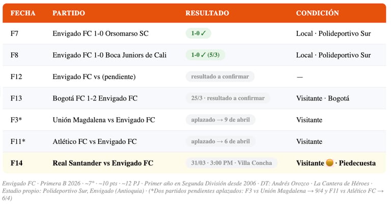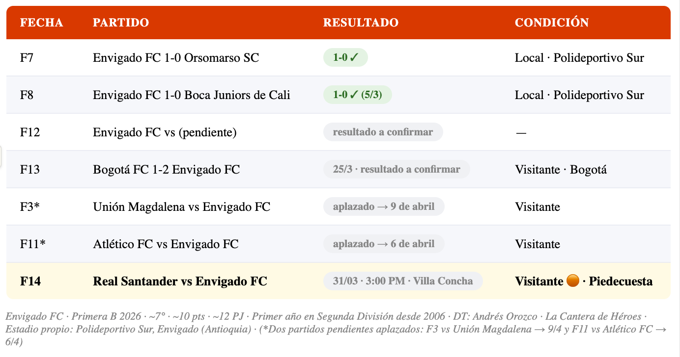 📊 Envigado FC — Primera B 2026: ~7° · ~10 pts · ~12 PJ · Cantera de Héroes