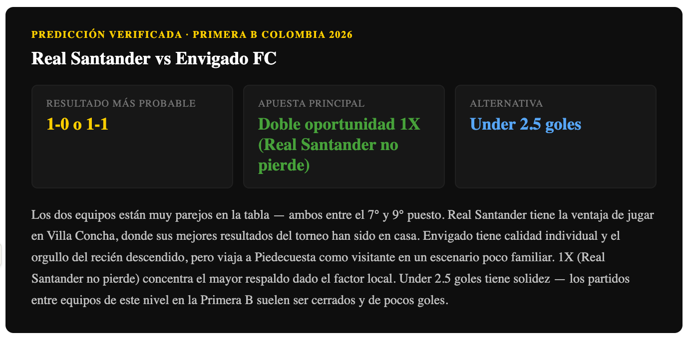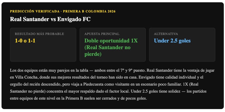 Los dos equipos están en niveles similares en la tabla — ambos con alrededor de 9-10 puntos. La ventaja de Real Santander es la localía en Villa Concha, donde ha conseguido sus mejores resultados del torneo. Envigado, con su modelo joven, puede generar situaciones pero le cuesta convertirlas de visitante. Doble oportunidad 1X (Real Santander no pierde) tiene el mayor respaldo dado el factor local. Under 2.5 goles también tiene solidez — ambos equipos son parejos y los partidos entre ellos suelen ser cerrados.