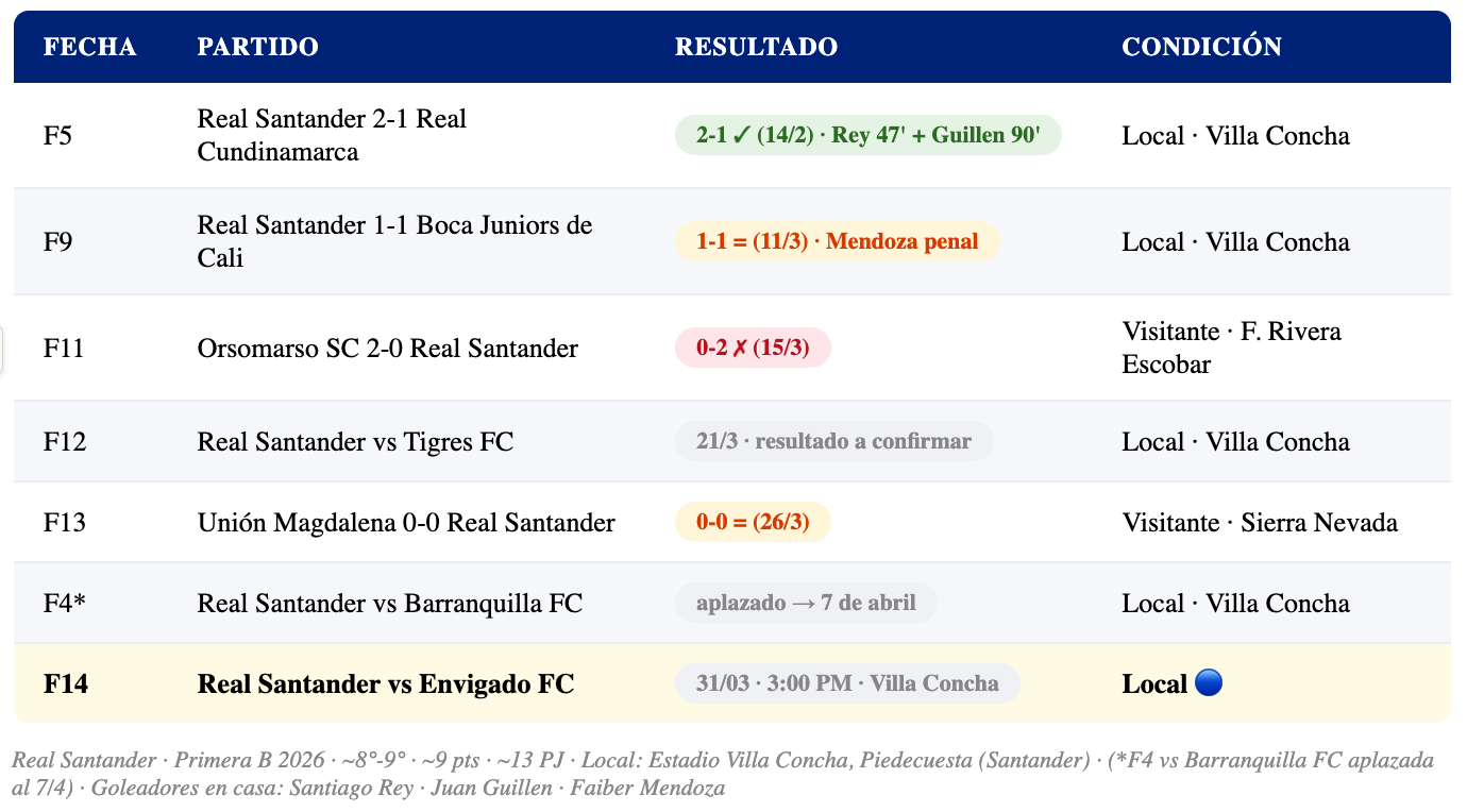 En la Fecha 9 (11 de marzo) empató 1-1 con Boca Juniors de Cali —Faiber Mendoza convirtió el penal del empate desde los doce pasos — y quedó 13° con 6 puntos. Real Santander tiene además un partido aplazado pendiente ante Barranquilla FC (reprogramado para el 7 de abril), lo que le da la posibilidad de escalar posiciones si aprovecha esos puntos en juego. Este partido ante Envigado es una oportunidad de oro en casa contra un rival recién descendido.