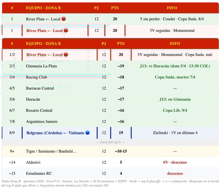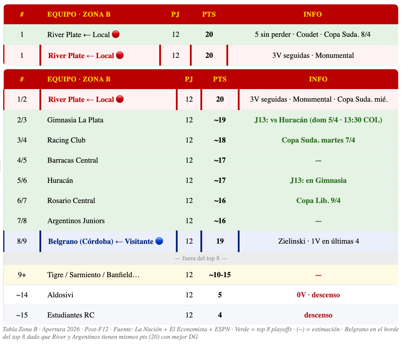 El Estadio Más Monumental de Buenos Aires — el estadio más grande de América — recibe este domingo uno de los partidos más atractivos de la Zona B. River Plate de Eduardo Coudet (2°, 20 pts, 5 partidos sin perder) recibe a Belgrano de Córdoba de Ricardo Zielinski (4°, 19 pts) con apenas 1 punto de diferencia. El ganador se afianza entre los primeros de la Zona B; el perdedor cede terreno en la pelea por los playoffs. Y River tiene otro desafío en la mira: Copa Sudamericana vs Blooming en Bolivia el miércoles siguiente.