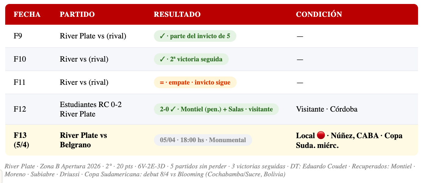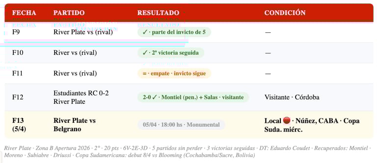 📊 River Plate — F13: 2° Zona B · 20 pts · 6V-2E-3D · 5 partidos sin perder · 3 victorias seguidas